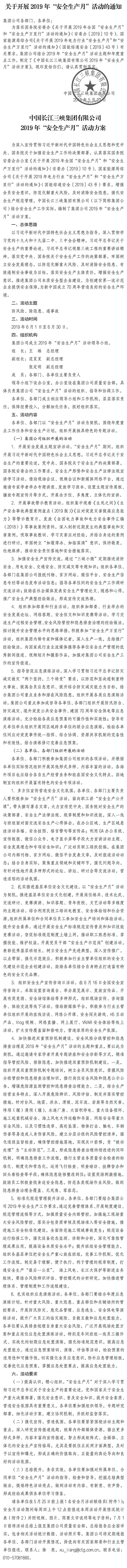 > 中國長江三峽集團有限公司關于開展2019年“安全生產月”活動的通知