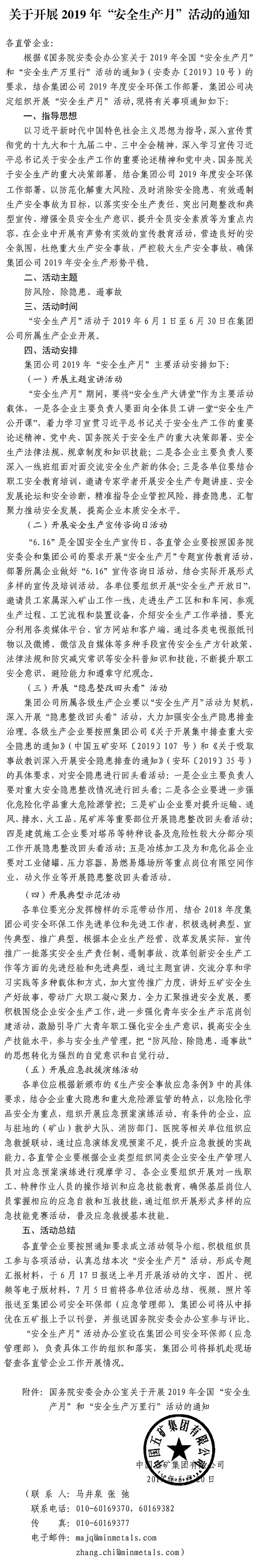 > 中國五礦集團有限公司關于開展2019年“安全生產月”活動的通知