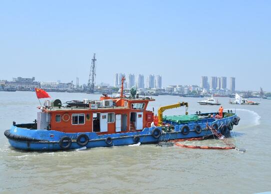 在不遠處的江面上,兩艘搶險船到達事故水域,圍油欄船在江面上放置圍油欄防止油品擴散,清污船投放繩索式收油機對江面油品進行回收,作業人員還向江面投放了吸油氈,噴灑了生物型環保消油劑,清除殘留油污,防止二次污染。