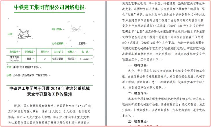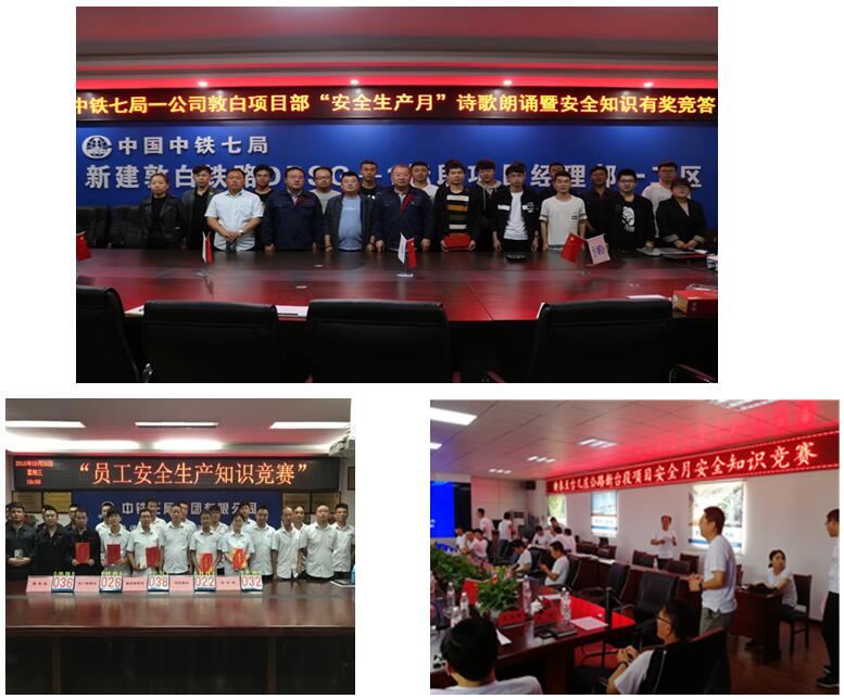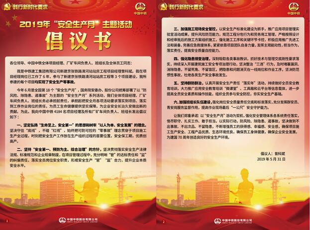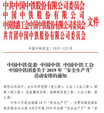 按照國務院安委會辦公室、國家鐵路局等上級有關“安全生產月”活動要求,中國中鐵股份有限公司于5月23日以黨政工團聯合發文形式印發了《中國中鐵黨委 中國中鐵 中國中鐵工會 中國中鐵團委關于2019年“安全生產月”活動安排的通知》(中國中鐵安監﹝2019﹞122號),對2019年“安全生產月”活動進行了安排部署,明確了總體要求、活動內容,成立了組織機構,組織各單位開展安全質量宣誓活動、主題宣講活動、“安全宣傳咨詢日”線下線上活動、安全生產大培訓活動、安全警示教育和科普宣傳活動、安全隱患排查治理活動、應急預案演練活動、“安全生產萬里行”、參與安全知識網絡有獎答題等一系列活動,并對開展各項活動提出了具體要求。
