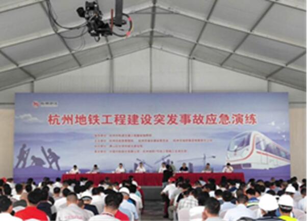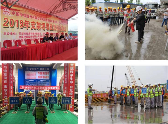 (六)開展應急演練活動。各單位和項目按照全國安全生產月活動組織委員會辦公室、國家安全生產應急救援指揮中心的要求,結合實際情況,結合地方政府、建設單位的具體安排,開展了針對隧道坍塌、深基坑坍塌、高大模板支護坍塌、腳手架坍塌、大型施工機械、觸電、防洪、防臺風等重點項目和季節性自然災害的應急救援演練。6月19日,由杭州市應急管理局、杭州市城鄉建設委員會和杭州市地鐵集團有限責任公司主辦,中國中鐵股份有限公司承辦的杭州地鐵工程建設突發事故應急演練在7號線五工區機場西站舉行,約600余人共同觀看了應急科技裝備展和應急演練。觀摩了演練活動。