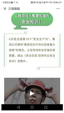 中鐵三局微視推出《為安全質量“管”“監”分離工作做“透析”》、《安全在現 現場作業安全知識》和《垂直極限 高處作業安全知識》宣教片,立足現場實際,分別介紹了機械操作、建筑施工、高處作業、電氣作業、有限空間作業的現場作業常識及引發事故原因,說明作業現場安全隱患排查重點工作及事故發生時應急救援處置的流程和方法。約2萬余名員工受到警示教育。
