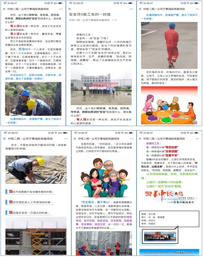 中鐵二局一公司寧奉城際鐵路項目,在《致工友的一封信》中,從家庭入手,真誠呼吁工友遵章守紀,保障自身安全,該文章發布在項目部微信公眾號上。