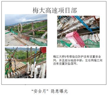 (五)開展安全隱患排查治理活動。各單位和項目在“安全生產月”期間積極開展安全隱患排查治理工作,加強了對重要區域、重點工程、重點單位、重要環節、重要裝置等“五重”的風險防控,切實排查施工現場安全隱患,防范、遏制生產安全事故,中鐵建工集團針對建筑起重機械進行了專項整治。股份公司主要領導及分管領導帶領公司安全質量監督部等有關部門同志按照”四不兩直“的方式對青島片區部分項目施工現場進行了安全質量檢查,對檢查發現問題的項目下發了監管通知書,指出了現場存在的問題和隱患。