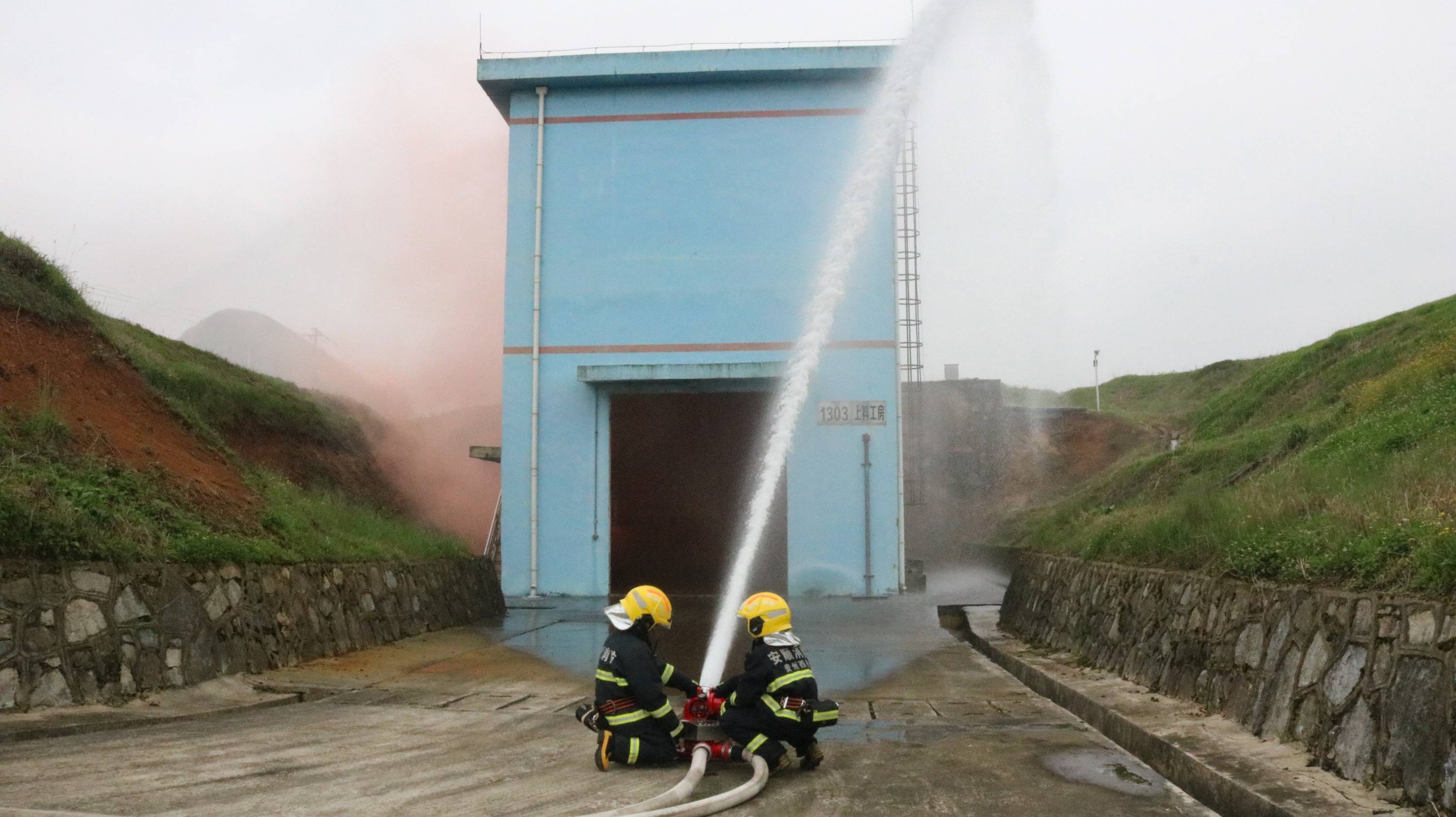 演練模擬假設安順久聯民爆有限責任公司低溫生產線控制室,通過報警系統發現,低溫乳化生產線2號水相配制罐攪拌電機溫度持續升高,突發火災,導致二人被困于低溫生產車間內。該公司立即啟動生產安全事故綜合應急預案,停止廠區內所有生產,相關人員迅速撤離至安全地帶,通知公司應急小組辦公樓前集合。隨即企業消防站人員迅速奔赴火災位置進行先期處置,并撥打119報警電話。安順市西秀區北二環路特勤消防站接到報警后,立即出動大功率水罐泡沫消防車到場處置,到達現場后經偵查發現該公司低溫生產線車間有濃煙冒出且有大量明火,有發生爆炸的危險性,指揮員對現場人員分配任務并立即下達作戰命令,一組進行安全警戒、一組雙干線出移動水炮對著火車間進行撲救、一組尋找水源進行供水,確保出水連續不間斷。