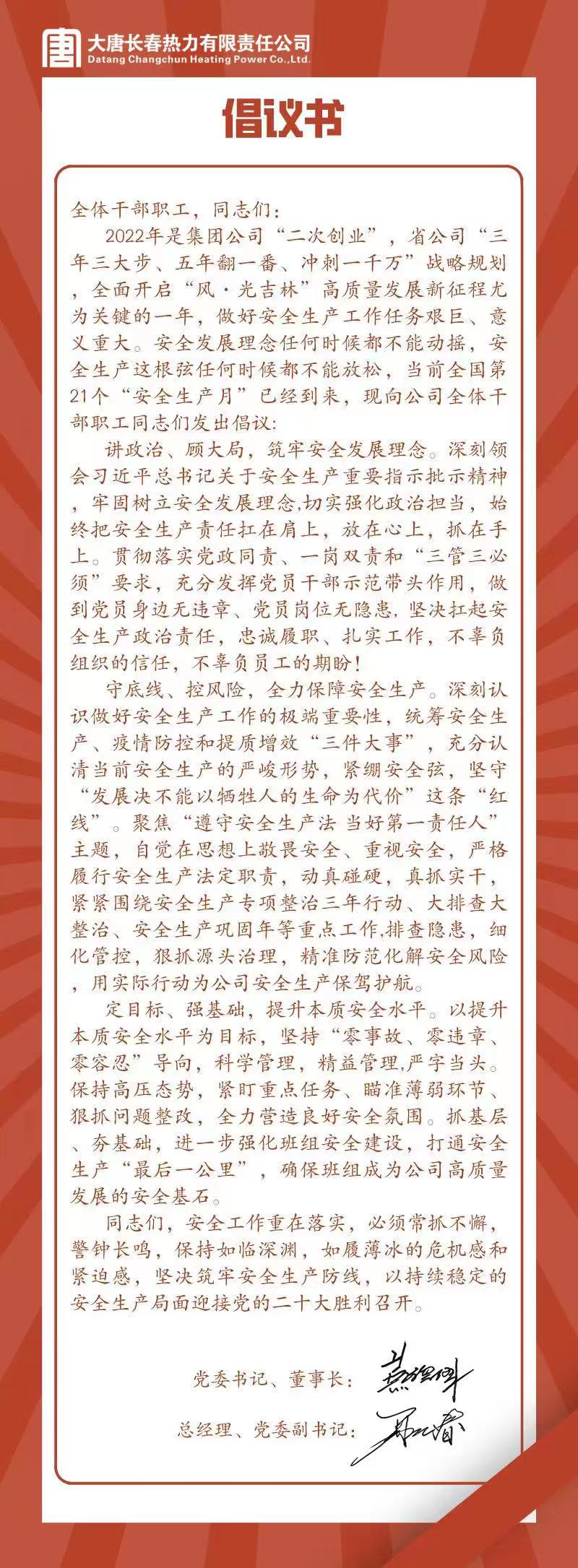 > 吉林公司所屬大唐長春熱力有限責任公司第一責任人安全倡議書