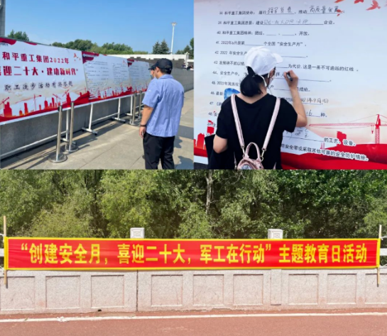 和平重工集團在安全生產月期間組織開展了“創建安全月 喜迎二十大 軍工在行動”主題教育日活動,現場懸掛宣傳橫幅標語,工作人員為職工們發放安全知識宣傳冊、扇子等宣傳用品,并在現場組織了安全知識有獎答題環節,調動廣大職工參與的積極性,大力營造了“關愛生命、關注安全”的良好氛圍。