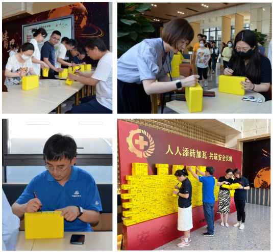 活動現場,職工們結合自己的崗位特點在“金磚”寫上自己的安全寄語、承諾及應急小技能并簽署上自己的姓名,一塊塊磚頭蘊含著一份份責任與擔當,搭建完畢的城墻氣勢磅礴,一股安全感,油然而生。