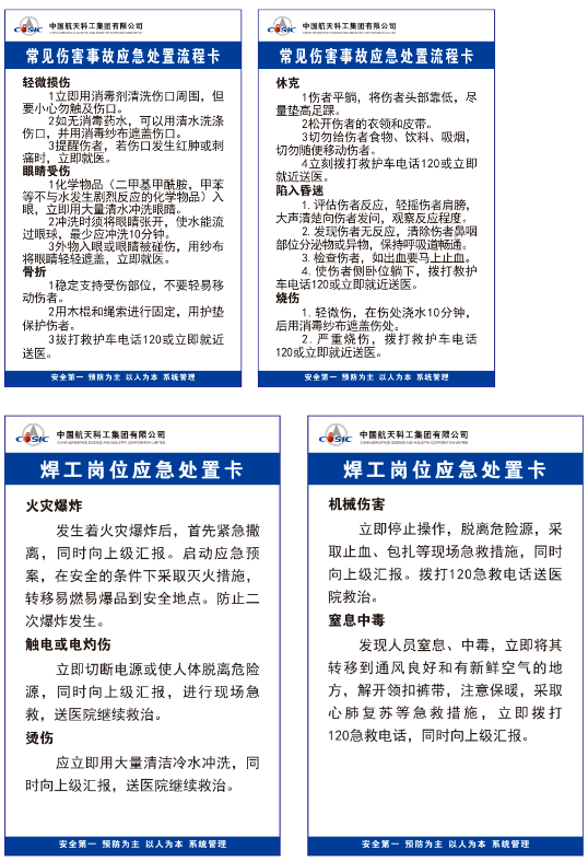 “小卡片,大作用”,早在2022年,技安部部長張小鵬就在研究如何加強公司安全應急管理基礎工作,提升第一現場、第一時間員工應對突發生產安全事故的能力,隨身應急處置卡就是最好的方法。一年來技安部持續開展應急預案的優化、簡化、卡片化工作,在重點崗位全面推廣實施“一案一卡”。按照航天三江應急處置要求,將新版本的應急處置措施進行了更新,制作了一批針對生產安全事故的現場應急處置措施,張貼在生產作業區墻上,但現場反響不是太好。太高了、字小了、看不清楚等問題給推進“一案一卡”工作帶來了阻力。張小鵬經過走訪提出,能否將應急處置措施再壓縮、再簡化,做成工藝文件大小或貼于設備、工位上或分發到每個操作人員?經過現場調查發現,張貼在設備上易脫落不美觀;張貼在工位上容易被文件遮擋,應用場景不夠全面;分發到操作人員又不便于攜帶,諸如此類的問題又帶來了新的困難。“不便攜帶”這個問題給了我們新的啟發,要方便攜帶,工作證大小的卡片正好合適,因為員工在公司都需要攜帶工作證,隨身應急處置卡放在工作證套里,就能即拿即看非常方便,于是工作證大小的應急處置卡片應運而生了。