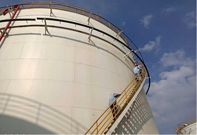 督導核查組專家登上儲罐頂部進行檢查。攝影:高佳