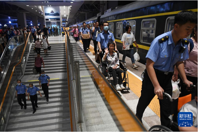 8月3日,K396次、Z180次列車的滯留旅客到達北京豐臺站。新華社記者張晨霖 攝