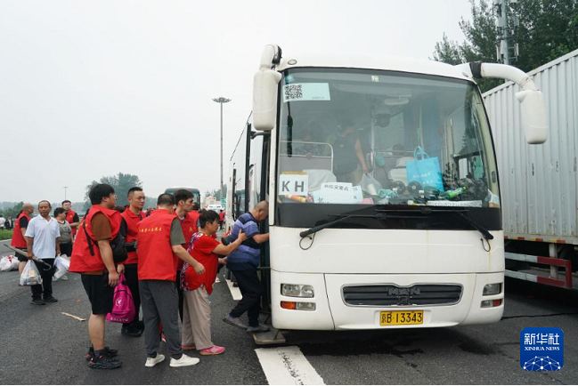 8月2日,在北京市房山區的京港澳高速琉璃河出口,受災群眾有序登上轉運車輛。新華社記者任超 攝