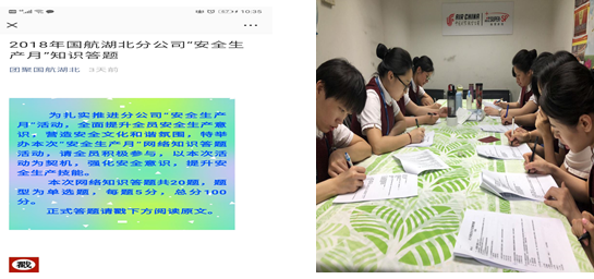 公司各單位充分利用網絡平臺、現場競答等多種形式開展安全生產知識競賽,如湖北分公司利用“團聚湖北”微信平臺舉辦了“2018年安全生產月網絡知識答題”活動;運控中心華東分控組織了“雷雨天氣應急處置演練與競賽”活動;地面服務部舉辦了“T2外航安全月競賽”等。