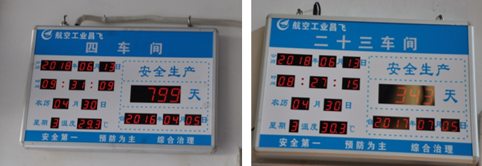 (一)航空工業昌飛:1.公司在基層單位生產現場試點設立安全生產計時牌,記錄基層單位最近一次安全生產事故以后至今的安全天數,不僅對現場作業員工起到警示作用,還對基層單位的安全生產責任意識和安全生產榮譽感起到積極的作用。