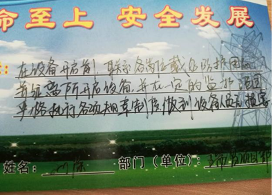 11.大唐魯北公司結合2號機B修,開展“寫一句安全提示語,走一條遵章守紀安全路”的專題活動。各生產部門人員(含項目部)和外包隊伍施工人員填寫了很多提示自己正確操作的語句或針對崗位特點的安全風險提示語或,在步入崗位之前又為自己上了一堂安全課。