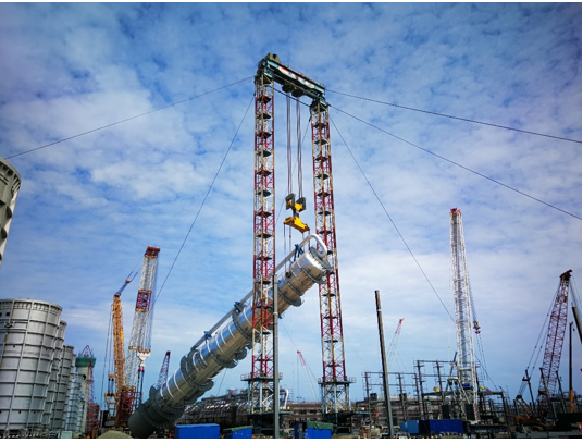 6月21日,中國石化煉化工程公司下屬的重型起重運輸工程有限責任公司自有的2500t液壓提升系統在文萊摩拉島成功將高73米、重710余噸的1#二甲苯塔穩穩降落在基礎上,這是國內自有大型吊裝機械第一次在海外完成如此大噸位設備的吊裝。