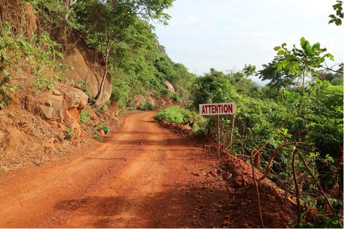 在進出施工工地的狹窄山路上設置警示牌