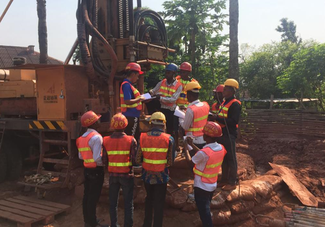 項目技術人員正在給當地新入職雇員講解各類施工設備的特性,以及與設備保持安全距離等安全細節。
