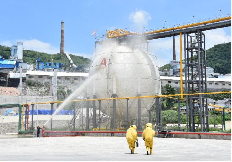 “哇嗚…哇嗚…哇嗚……”現場消防警報聲響起,兩名身著黃色重型防化服的企業員工一路狂奔,緊急前往事發罐區進行工藝處置,與此同時,還有一名員工迅速打開水炮對準A號液氨球罐,用水冷卻容器。大約五分鐘后,消防車趕到現場,繼續向A號液氨球罐射水滅火。一場“真刀實槍”模擬液氨泄漏引發火災事故的消防應急演練在貴州西洋實業有限公司(以下簡稱西洋實業)上演。