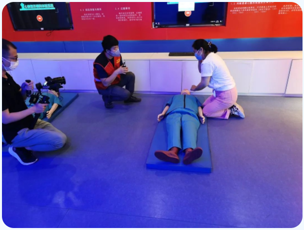 隨后,來到直播的第二站,位于中關村街道的中關村安全宣教基地,在基地講解員王鳳龍的帶領下,主持人參觀了安全宣教基地的6大區域,24個安全體驗項目,帶領網友體驗了VR設備,學習心肺復蘇、AED急救措施、滅火器使用,沉浸式體驗醉駕、地震、火災逃生等項目。