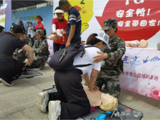 活動現場,群眾在工作人員指導下學習心肺復蘇急救技能。 石榴云/新疆日報記者張艷芳攝