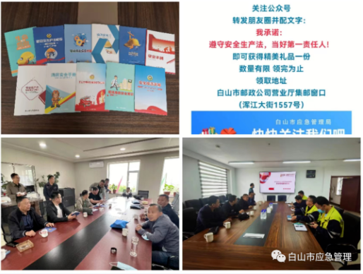 白山市安委辦開展微信朋友圈安全承諾;在辦公樓前設立咨詢臺,并向參與群眾發放宣傳資料、紀念品和16種安全文化、安全常識手冊;深入企業開展政策解讀、理念宣貫、警示提醒等活動。