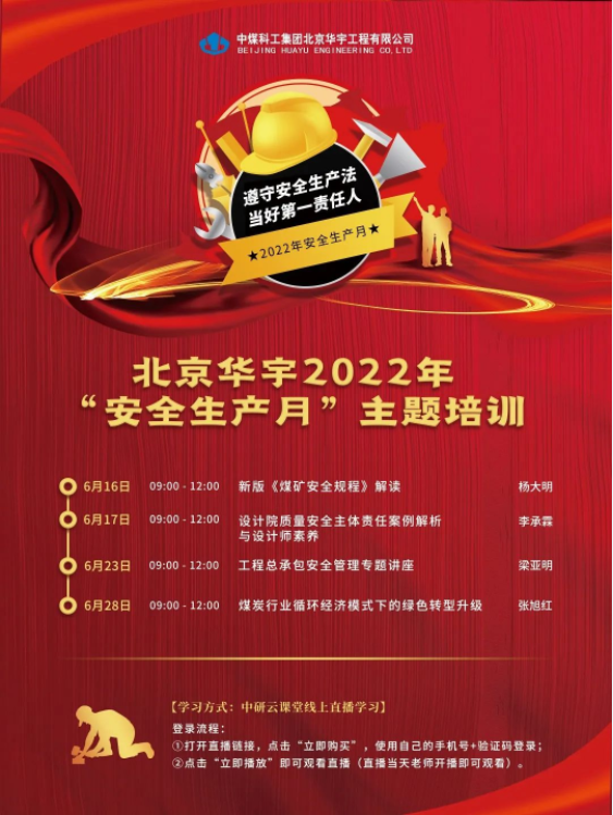 北京華宇精心組織策劃,重點圍繞“煤礦安全規范”“技術服務質量安全”“工程總承包安全管理”“生態環保及轉型發展”等方面內容,分四期開展“安全生產月”主題培訓活動。本次培訓采用線上線下結合的方式,公司領導班子成員、高管、各單位部門負責人及一線人員累計超過1100人次參與培訓,取得良好效果。