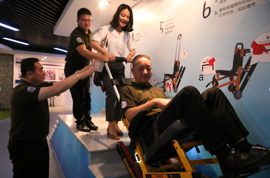 采訪團記者在萬事興醫療器械股份有限公司現場體驗樓梯擔架