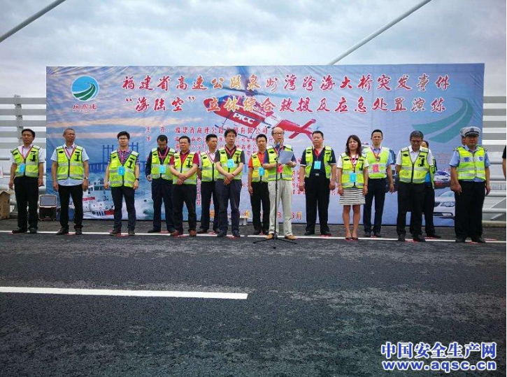 本網訊 記者張春 通訊員許師偉 林強 楊帆 泉州灣跨海大橋于2015年5月12日建成通車。正值2018年全國第十七個“安全生產月”,福建省高速公路集團有限公司于6月21日上午在泉州灣跨海大橋舉行突發事件“海陸空”立體綜合救援及應急處置演練。正好在泉州市調研督導該市安全生產月活動情況的全國安全生產月第四調研督導組一行,參加觀摩了此次綜合救援及應急處置演練。